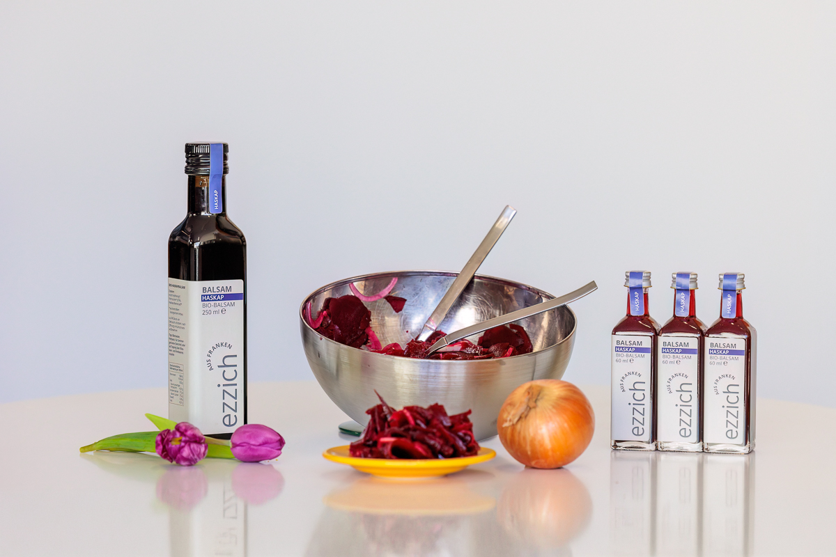 Unser Tipp: Blattsalate, Feldsalat, Rote Beete Salat, verdünnt mit Wasser als Trinkessig, je eine Kugel Blaubeer- und Himbeereis und je nach Geschmack den Balsam drüber träufeln :-)